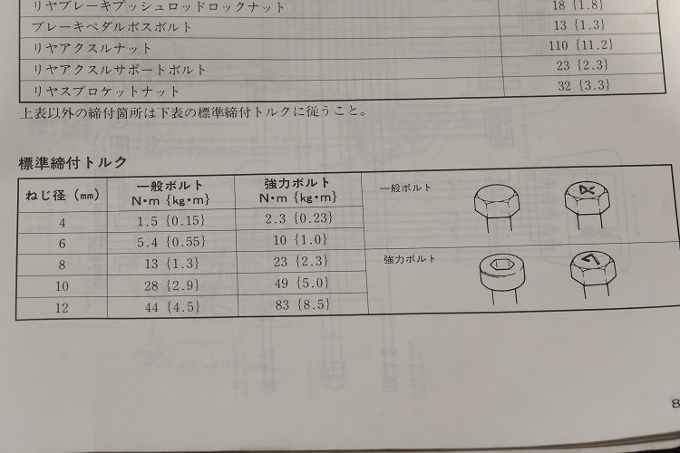 締め付けトルクが指定されていない一般ネジの締め付けトルクは、ネジ径によって定められている。画像はスズキGSX1100Sカタナのサービスマニュアルに掲載されたトルク値で、一般ボルト(無印または強度表示4)と強力ボルト(強度表示7)で明確に異なる。