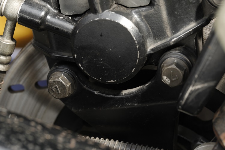 同じくスズキGSX1100Sカタナのリヤブレーキキャリパーボルト。ネジ径はM10で頭に7の浮き文字がある強力ボルトなので標準締め付けトルクは49N・mとなるはずだが、サービスマニュアルでは38N・mが指定トルクとなっている。