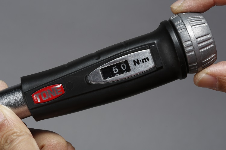 グリップとボルトの間に手を添えると余計な支点となり測定値に影響を与える可能性があるため、ラチェットヘッドやソケットには触れないようにして締め付けを行う。
