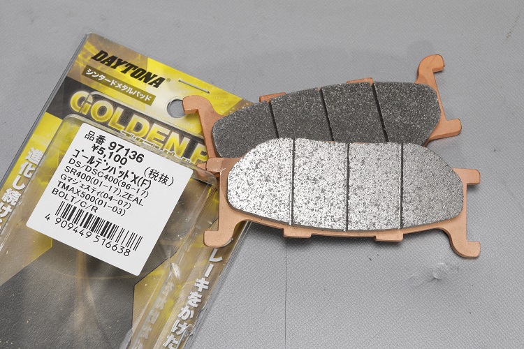 社外製ブレーキパッドの一例(デイトナ製ゴールデンパッド)。3本の溝が刻まれたグレーの部分がディスクローターに接するライニングで、その下のゴールドの部分がバックプレート。バックプレート両端のツメがキャリパーサポートに組み付けられる。