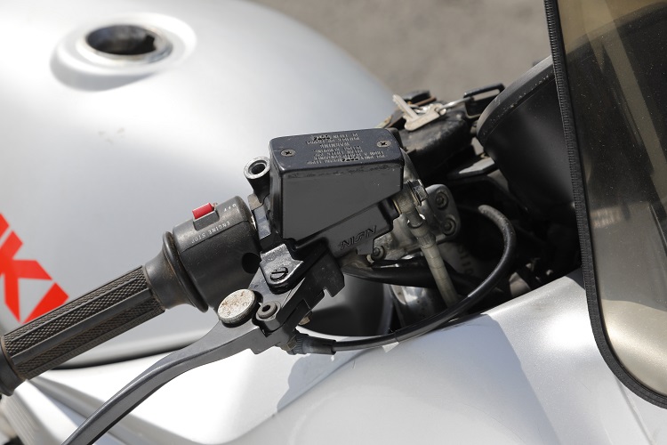フロントブレーキの根元にあるのがマスターシリンダー。リザーバータンク内にはブレーキフルードが入っており、レバーを握るとブレーキホースを通ってブレーキキャリパーに送り込まれる。