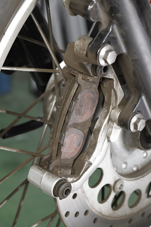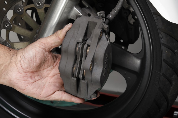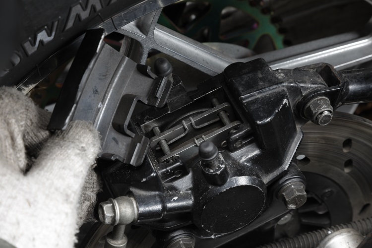 ブレーキホースからブレーキキャリパーに流れ込んだブレーキフルードがキャリパーピストンを押し出し、ピストンと接したブレーキパッドがブレーキローターを挟み込むことで制動力が発生してバイクが減速する。最悪の「鉄板ブレーキ」を避けるため、ブレーキパッドはライニングが無くなる前に交換する