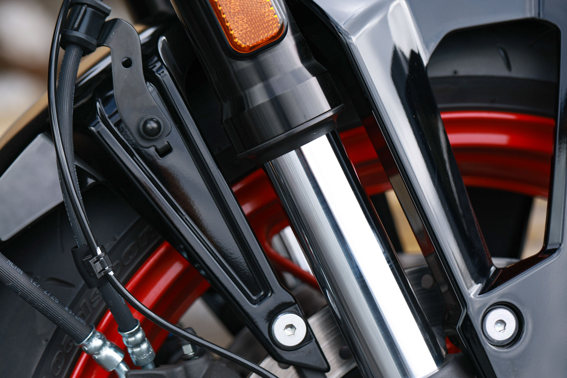 走行性能と安全性に直結する足回りのチェックでは、まず「オイル漏れ」の有無を重点的に確認します。インナーチューブの可動部(摺動部)に、にじみや垂れた跡がないかを凝視しましょう。