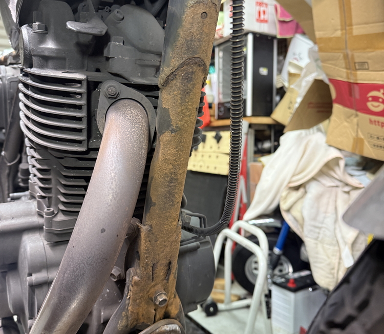 鉄フレームのバイクの場合、製造工程上で必要なパイプの穴から浸入した水分によって内部からサビが進行することもあります。