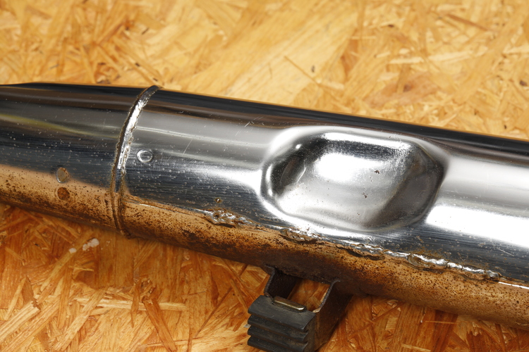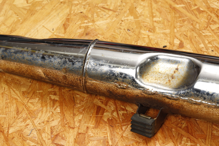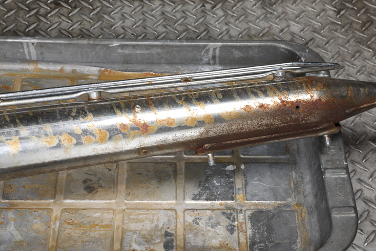 上面はさほどでもないが、下面にサビが集中しているクロームメッキ仕上げのマフラー。点状に見えるサビは、メッキ被膜の下に浸入した水分が鉄の素地に反応して発生したもの。