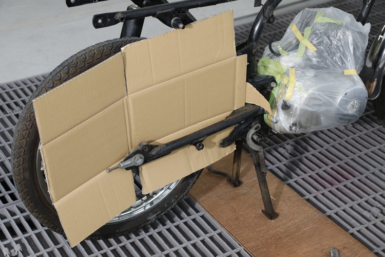 フレームやスイングアームを缶スプレーで補修する際も、目の粗いサンドブラストで擦ると深い傷が付き、スプレーで段差を埋めるのに手間が掛かります。