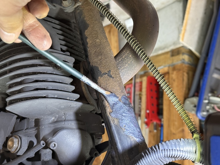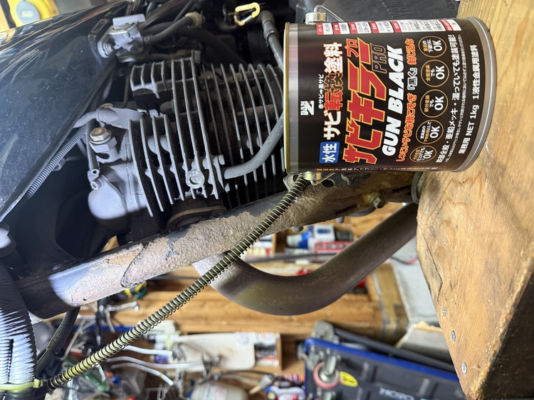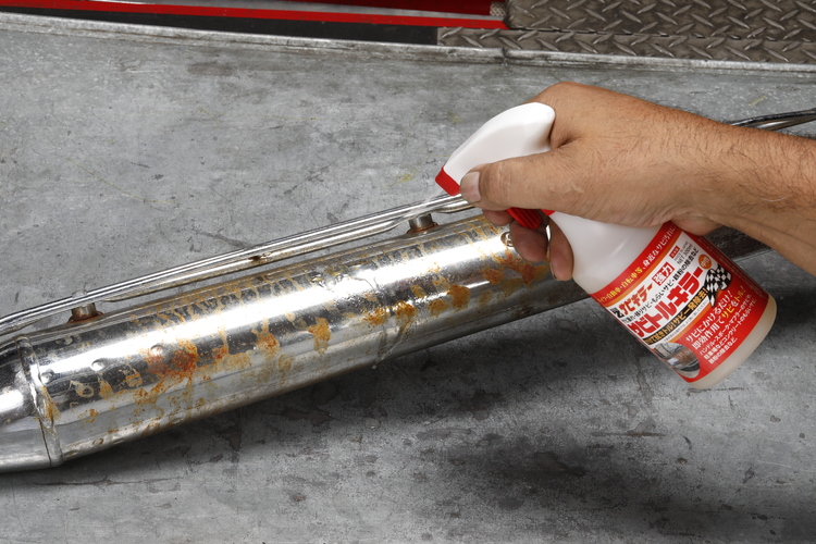 錆びたクロームメッキマフラーにサビトルキラーをスプレー。