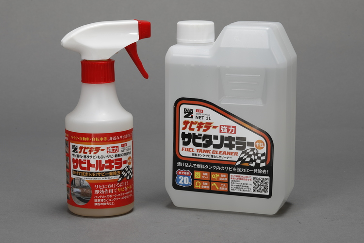 BAN-ZIのサビトルキラー(左)はサビにスプレーするだけで除去できるケミカル。成分中のチオグリコール酸塩が赤サビを溶かすので、強く擦ることなくサビ落としができる。