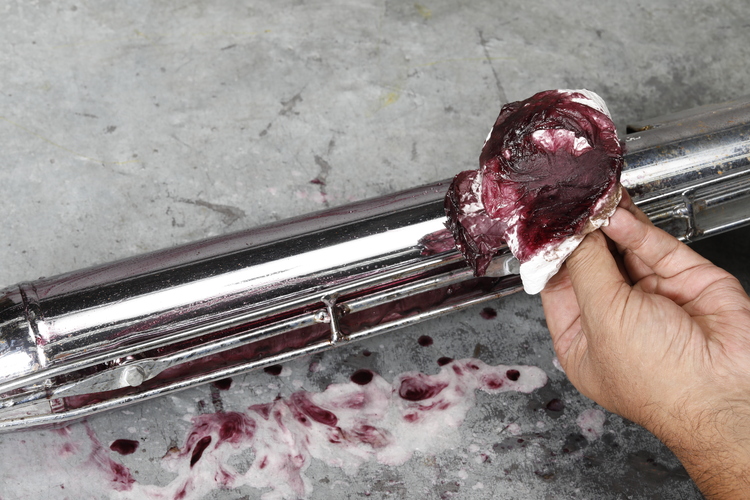 サビトリキングはペースト状で、付属の専用クロスで磨き上げる。たっぷり付けて優しく磨くのが、クロームメッキ表面を傷付けないためのポイント。