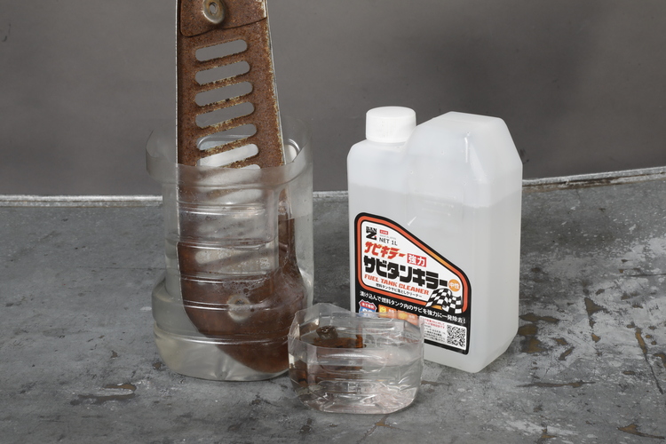 サビタンキラー(左)はガソリンタンクをはじめ頑固なサビに漬け込むことでサビ取り効果を発揮する。