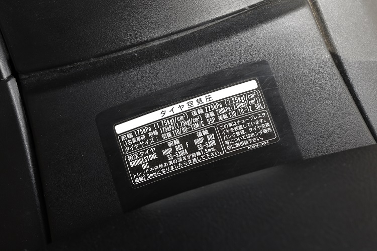 指定空気圧はスイングアームやチェーンガードにステッカーが貼ってあることが多く、車種によっては1名乗車時と2名乗車時で異なる空気圧(2名乗車時は後輪の空気圧が高く設定されている)が表示されている場合もあります。