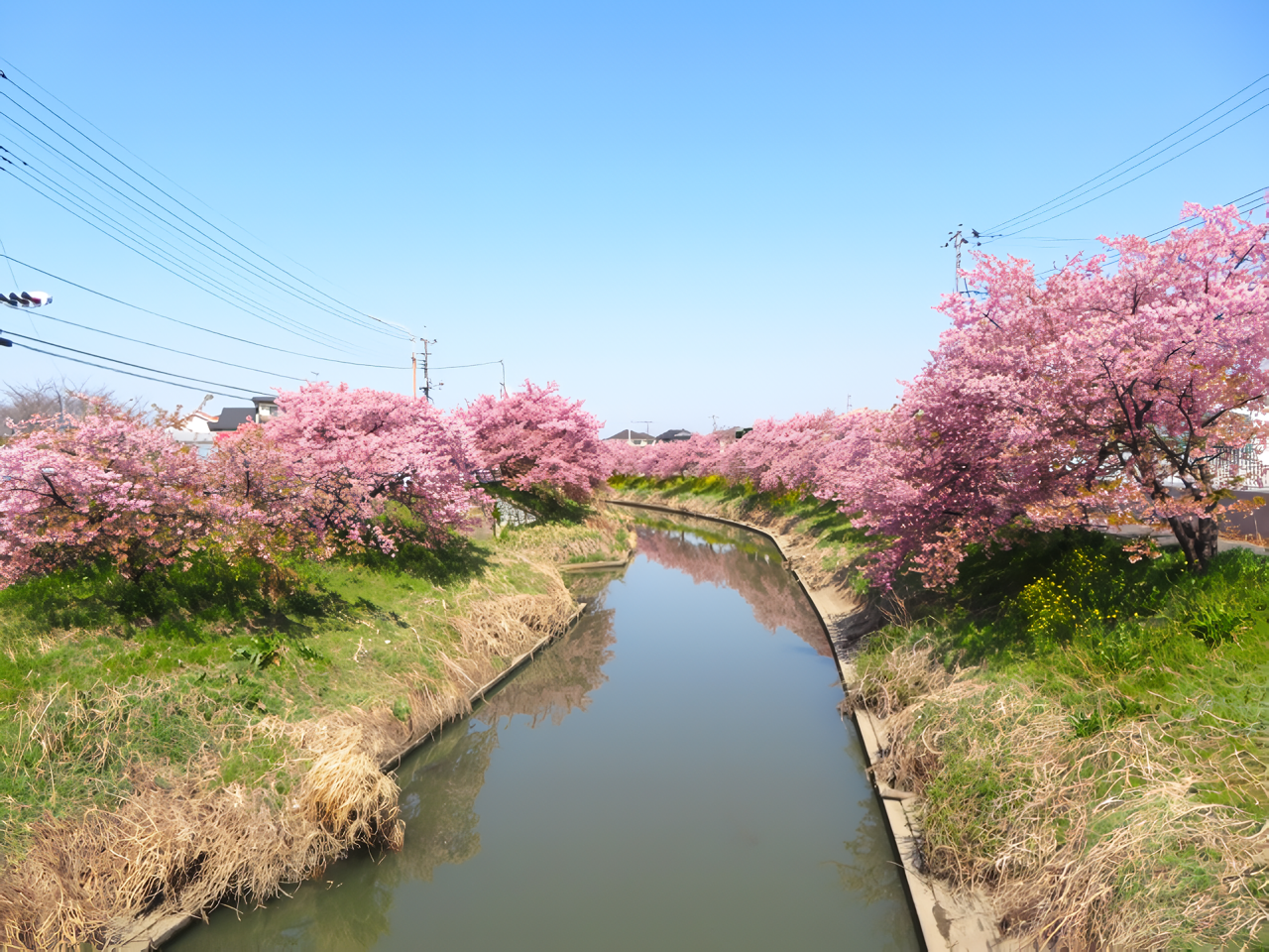 出典:photo AC久喜市を流れる青毛堀川沿いには、約2.5kmにわたって約335本の河津桜が植えられています。鷲宮神社の近くから始まるこの並木道は、川の両岸を鮮やかなピンク色が彩り、水面に映る景色もまた格別です。
