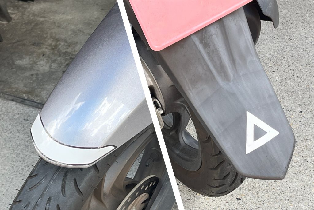 後方の三角マークは、ナンバープレートの色で代用が効きやすいですが、前方から原付二種であることを識別するにはフロントフェンダーの白いラインが非常に重要になります。