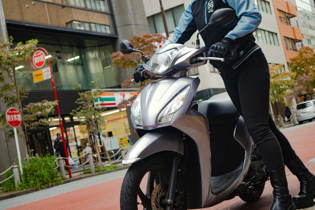 ホンダ「ディオ110・ベーシック」(原付二種)こうした識別が難しい状況において、交通ルールが異なる両者をスムーズに見分けて交通の円滑化と事故防止に役立てるため、メーカーが自主的に白い三角マークや白いラインを取り付けているのです。