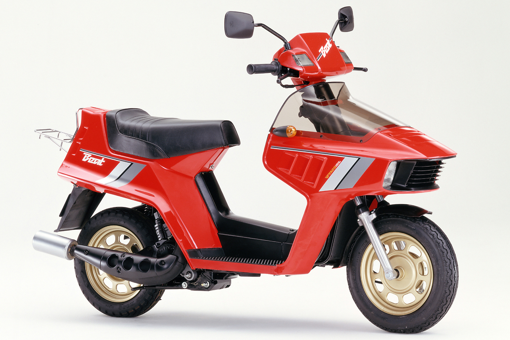 まるでクルマのような左右ヘッドライトを備えた斬新なスタイリングが特徴な「ビート」は、世界初の水冷2サイクル50ccエンジンを搭載した快速スクーター。