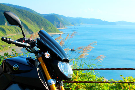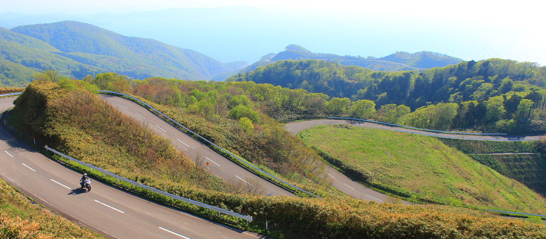 九十九折れの連続する小泊側の山岳ワインディングは、テクニカルながら走り応え抜群。舗装状態の良さも相まって、バイクで来た事を心より感謝するに違いない。コーナーをクリアするごとに、入れ換わる海と森の背景。潮風と共に山岳風景を楽しめる国内でも大変珍しいルートだと言えるだろう。