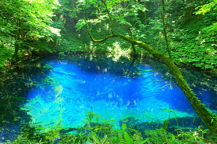 世界遺産白神山地を象徴する絶景スポットがこの青池。蒼く透き通る神秘的な湖水の色はまさに秘境の色。観光客も多いが、一度は行っておきたいポイントだ。
