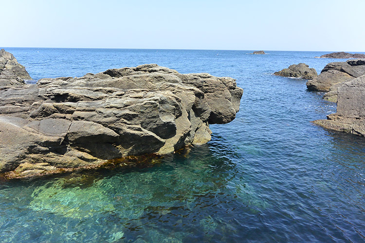 一面に広がる奇岩が異世界感抜群の情景を醸す千畳敷海岸。海水透明度も抜群!彼方には北海道。本州最果ての旅情抜群のスポット。岩礁の穴より噴き出す潮がダイナミック!
