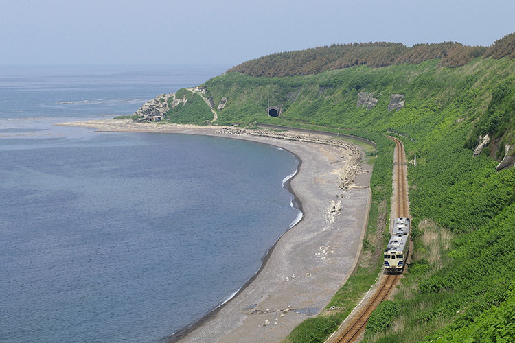 海岸線間近を辿るローカル単線がこの五能線。旅情抜群の情景は乗って良し、眺めて良し。鉄道ファンには定番だが、列車と併せた情景も美しい。