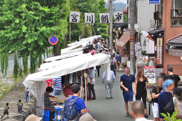 市内中心部の宮川沿いで毎朝開催されている高山市定番の観光スポット。