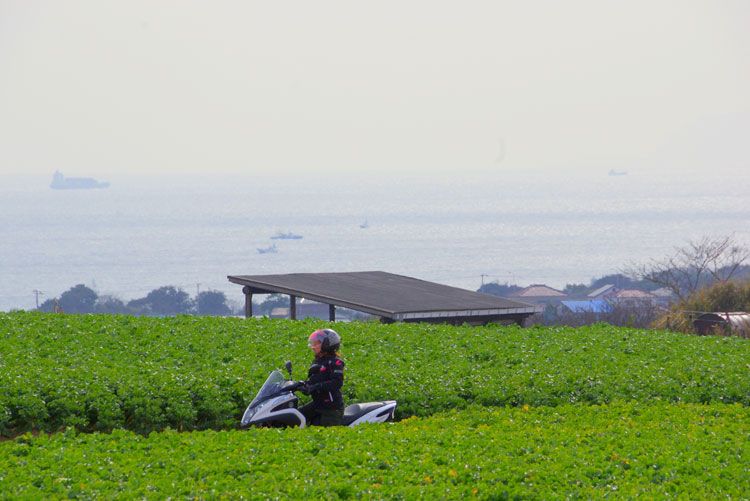 そして、最大のハイライトは小高い丘のピークより駆け下る後半部分。一面大根菜の緑が広がる日本の原風景的な畑地帯を抜けると、正面に相模湾を見据えつつ一気に丘陵を駆け下る。まるでローラーコースターのような雰囲気を味わえるのだ。ピークより眼下に広がる畑作地帯はまるでパッチワークのよう。まさに様相はミニ北海道!小粒ながら爽快感抜群の雰囲気を味わえる。