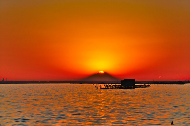 霞ヶ浦より富士山までは約170km離れているが、夕陽と共にダイヤモンド富士を望む事ができる。