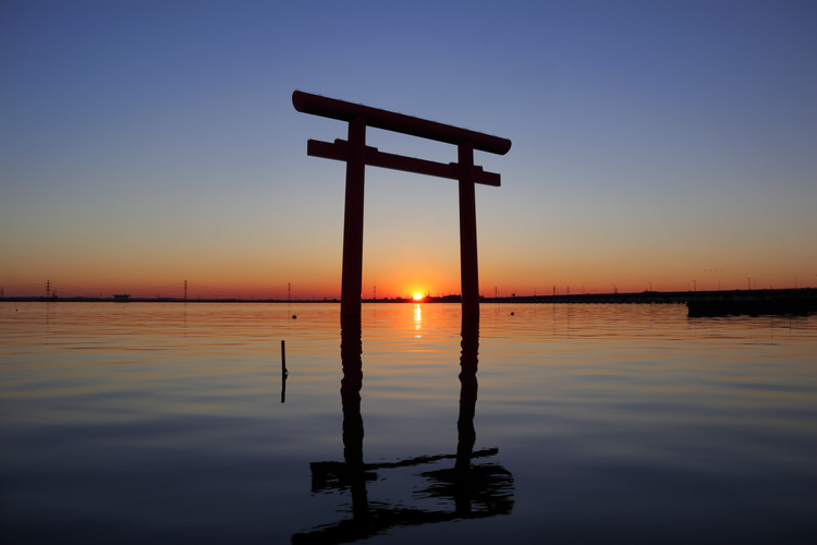 鳥居を潜るように沈む夕陽が大変見事で、北浦の水面に映る夕陽と夕焼け、シルエットとして浮かびあがる鳥居の情景は穴場的絶景だ。