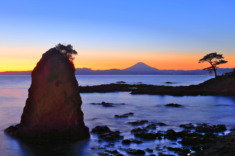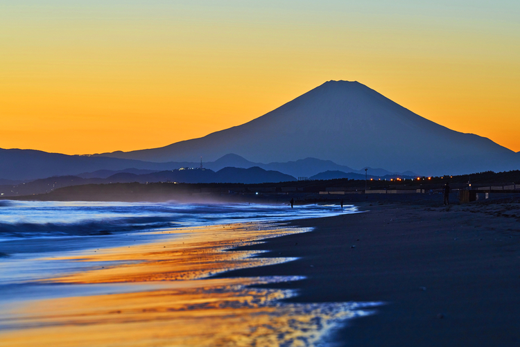 中でも辻堂海岸の風景は、マジックアワーの空が織りなす美しい情景に浮かび上がる富士山の情景が見事な事で有名。