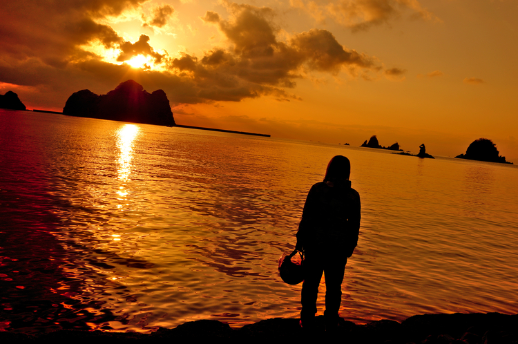 日中も存分にその風景を楽しめるが、夕暮れ時は海面に映る夕陽・夕焼けと立石のコントラストが大変見事。