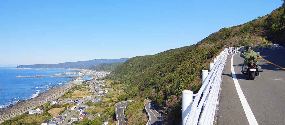 室戸スカイライン上から遠望した絶景の海岸線沿いに伸びる国道55号線も、地域定番の絶景ロード。特に東洋町から室戸岬までの区間は、高い岸壁も少なく太平洋のすぐ脇を走れる超絶爽快ロードだ。