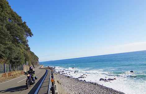 風やうねりの強い日は国道上まで波が上がってくる事も珍しくはない。常に潮が舞っている為、バイザーが曇りがち。ウェットティッシュ等を持参しておくと後で便利だろう。 -