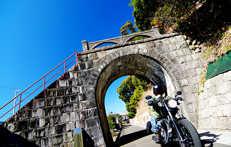 魚梁瀬森林鉄道遺構の象徴たる見事な石造アーチ橋。林鉄が寺社の境内を通過する為、人用橋として建設された。隧道を彷彿させる美しい造形は多くのファンを魅了する。林鉄跡は生活道路として舗装整備されておりバイクでの走行も可能。但し一帯は住宅地の為、安全とマナーには十分気をつけて見学して頂きたい。 -