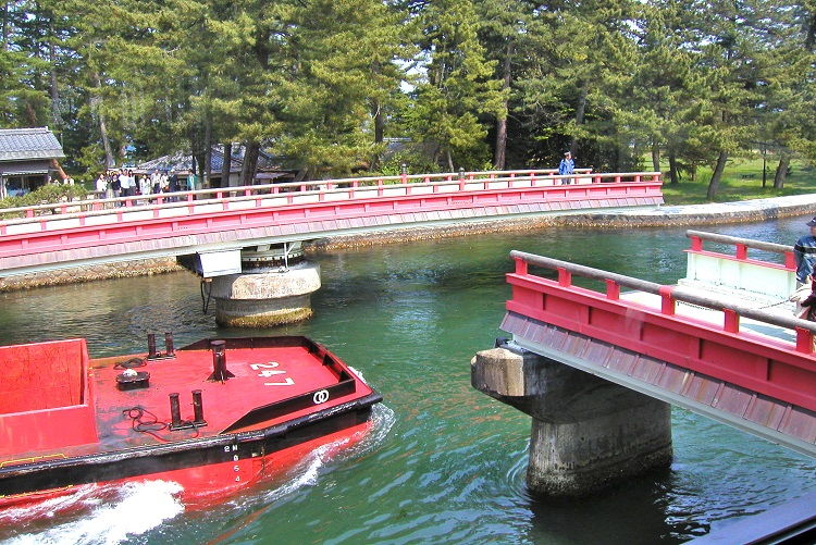 天橋立南端部の水路に位置する可動橋。船舶の往来時に90°回転して進路を作る珍しい橋だ。正式名は小天橋。一日で多い時は50回程度可動している。