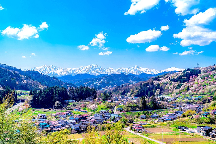 段々畑の斜面一面にベニシダレやエドヒガンなど多種の桜が咲き乱れ、絵画のような景色を楽しめる。正面にそびえる残雪の輝く北アルプス連峰の威容と桜のコラボはこの時期だけの絶景。最も美しいポイントは道の駅おがわの北約200m地点の農道上。観光地ではないためマナー良く鑑賞しよう。