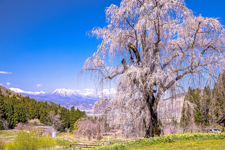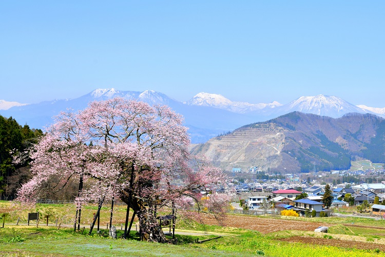こちらも樹齢500年を超える古いエドヒガン桜で、高台の田園に佇む姿は日本の原風景そのものだ。
