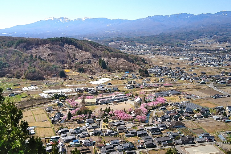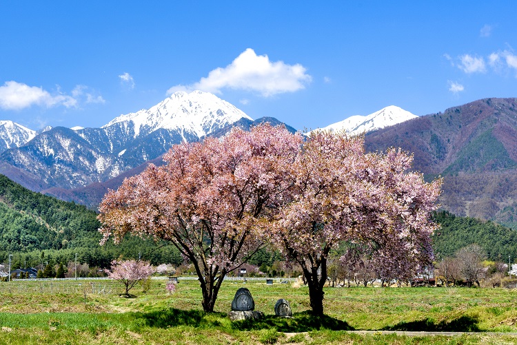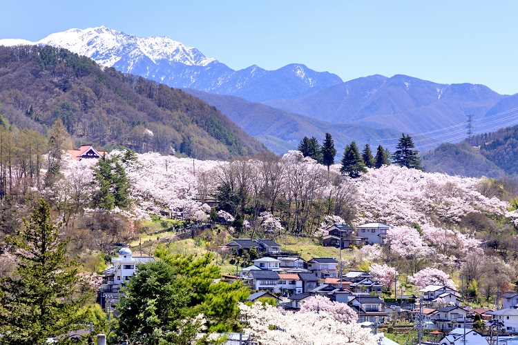 全国に桜の見事なスポットは多々あるが、アルプス連山の絶景とコラボし見るだけで感動する桜風景は信州だけの特権。