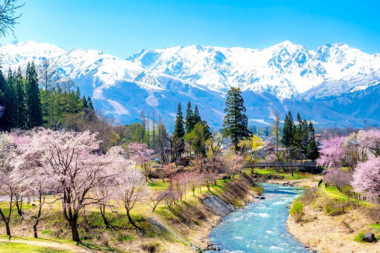 姫川沿いに咲く桜並木と吊り橋。背後にそびえる残雪の北アルプス連山。日本と信州風景の美しさを直感的に感激できる桜絶景。