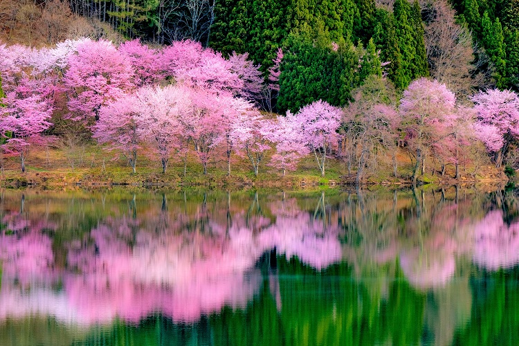 湖岸には約300本のオオヤマザクラが群生しており、濃いピンク色の花が特に際立つ。