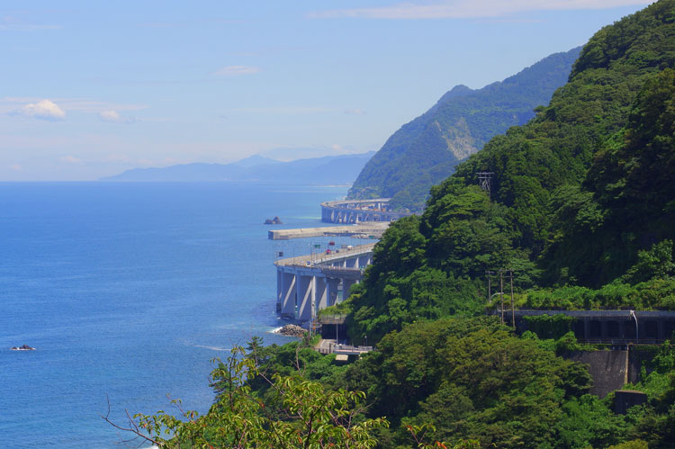 現在、高速道路は海上を橋梁で。一般道は危険個所を覆道で抜ける為、万一の落石時でも全く問題はないが、ルート上より眺められる豪快な海岸線はまさに絶景!途中には展望台も設けられており、太古の昔より人々が戦ってきた自然の暴威たる風景を一望する事も可能だ。