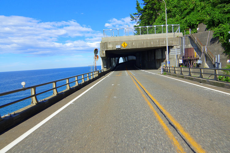 コンクリートの擁壁が続く覆道内は意外と明るく、荒々しい海岸線を望む事も可能。この異世界感抜群の風景が連続で点在する、大変特徴的な国道区間だ。