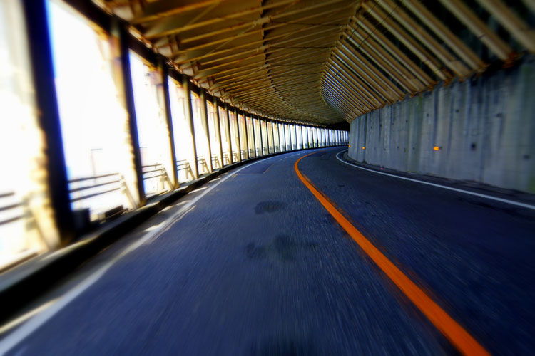 人類の英知の粋を尽くした高速道路もこの区間を掘り抜く事はできなかった。現在、高速は橋梁にて海上を。一般道路のみ覆道にて岩盤上をトラバースしている。