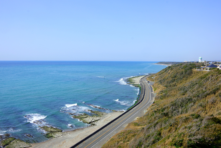 御前崎灯台より今まで走ってきた道を一望できる。目前は太平洋。この先、アメリカまで水平線以外なにも無し。地球の丸さを実感できる水平線をぜひキミの目で堪能しよう!
