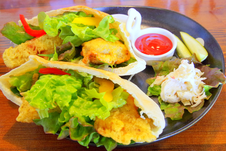 海鮮と比べると多少地味ながら、ご当地名物の“波乗りバーガー”も美味い。これは名産のシイラを使ったフィッシュバーガーだ。こちらはピタパンスタイル。とにかくデカい!腹を減らして行こう。