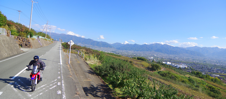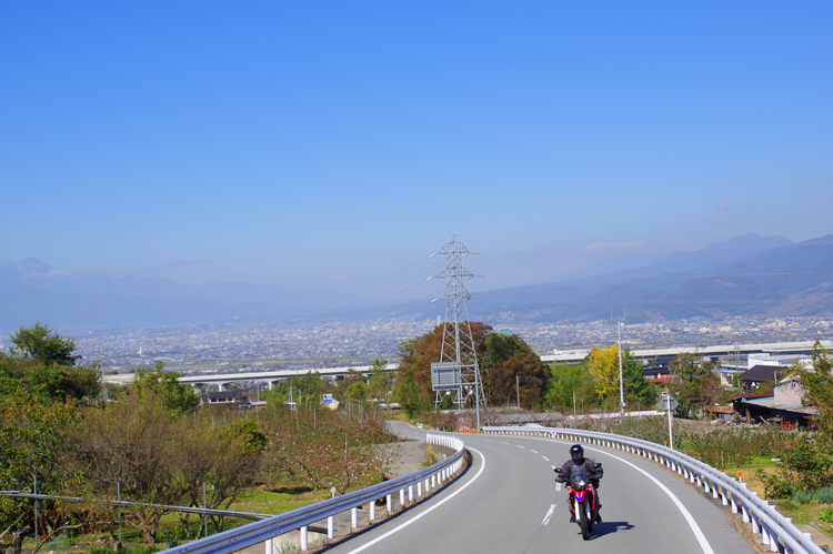山麓沿いに果樹園を繋ぐように延びるルートの為、展望は抜群!周囲は果樹園として整備されており、灌木は伐採され見通しも良好。市街地に極めて近いながら、農地を繋いており信号もほぼ皆無。大展望と爽快路を高い次元で両立したルートとして、山梨県内はもちろん、首都圏ライダー達の聖地と化しているルートと言っても過言でない。