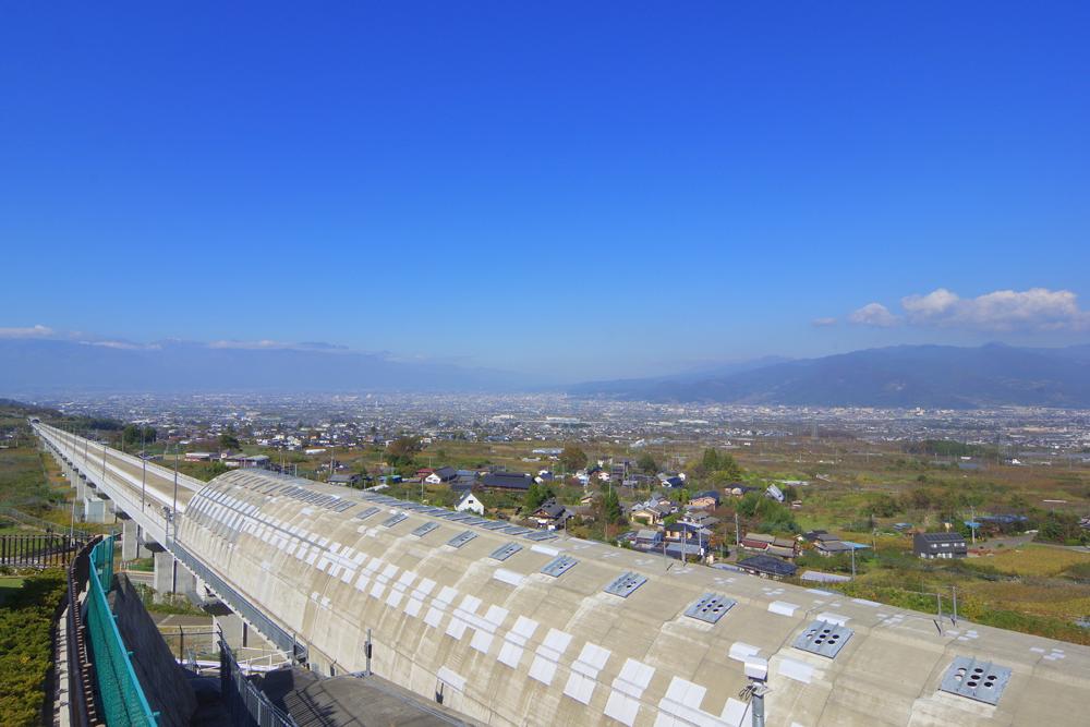 みやさか道沿線も甲府盆地の展望を楽しめる。盆地南側の山麓にはリニア実験線が走っており、甲府盆地一望の絶景と共にリニアの実験車両も同時に見学可能な場所もあるぞ。
