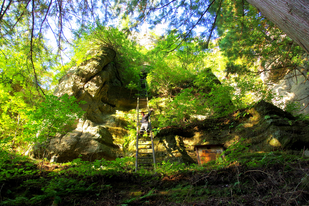 行基が開創したと伝えられる洞窟社。拝殿は岩盤内に穿たれており、90年前に設置された17mもの鉄梯子にて参拝する。徒歩約25分の山中にあるが衝撃的なインパクトさだ。