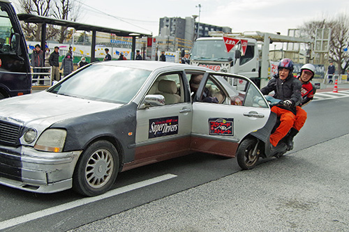 自分がバイクで走っていて高級車と衝突し、はじかれたバイクがガードレールや自動販売機に当たって破損させたというケース。