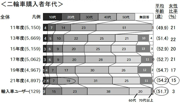 なお、現在のライダー人口は第2次ベビーブーム(1971~1974年)前後に生まれ、80年代バイクブームを経験した50代が最も多くなっています。