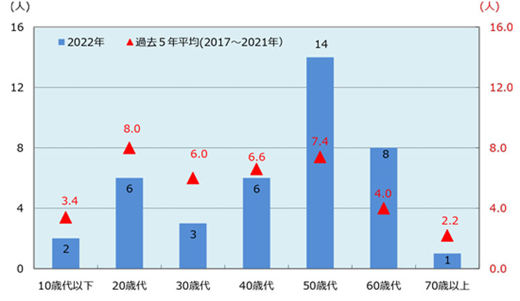 ライダー人口にとって50代は母数が最も大きい世代ということもありますが、二輪車保有台数が最も多い東京都における二輪車乗車中の交通死亡事故を年代別に見ると、50歳代が突出して多いことがわかります。過去5年の平均と比べると20~30歳代は減少しましたが、50~60歳代は倍増してしまっています。