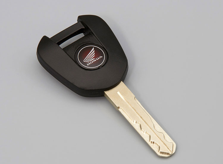 通常のキーシリンダーの仕組みに加えて、キーの頭や柄に内蔵されているICチップからのIDコードが合致した場合のみエンジンがかかるようにしてある、防犯性の高いイモビライザーシステムに対応したキーです。下写真はホンダCB1100EXのもの。